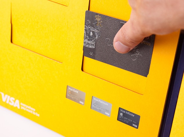 The purpose of this cardboard device is to showcase all technological possibilities of the premium cards production. Should your CEO want a transparent card – we have one, a carbon one – no problem, we got this one as well. Generally the panel presents all the variety of possible card design options. It quickly folds and unfolds for the showcase and the cards are easily retrieved from the card slot for a tactile acquaintance.